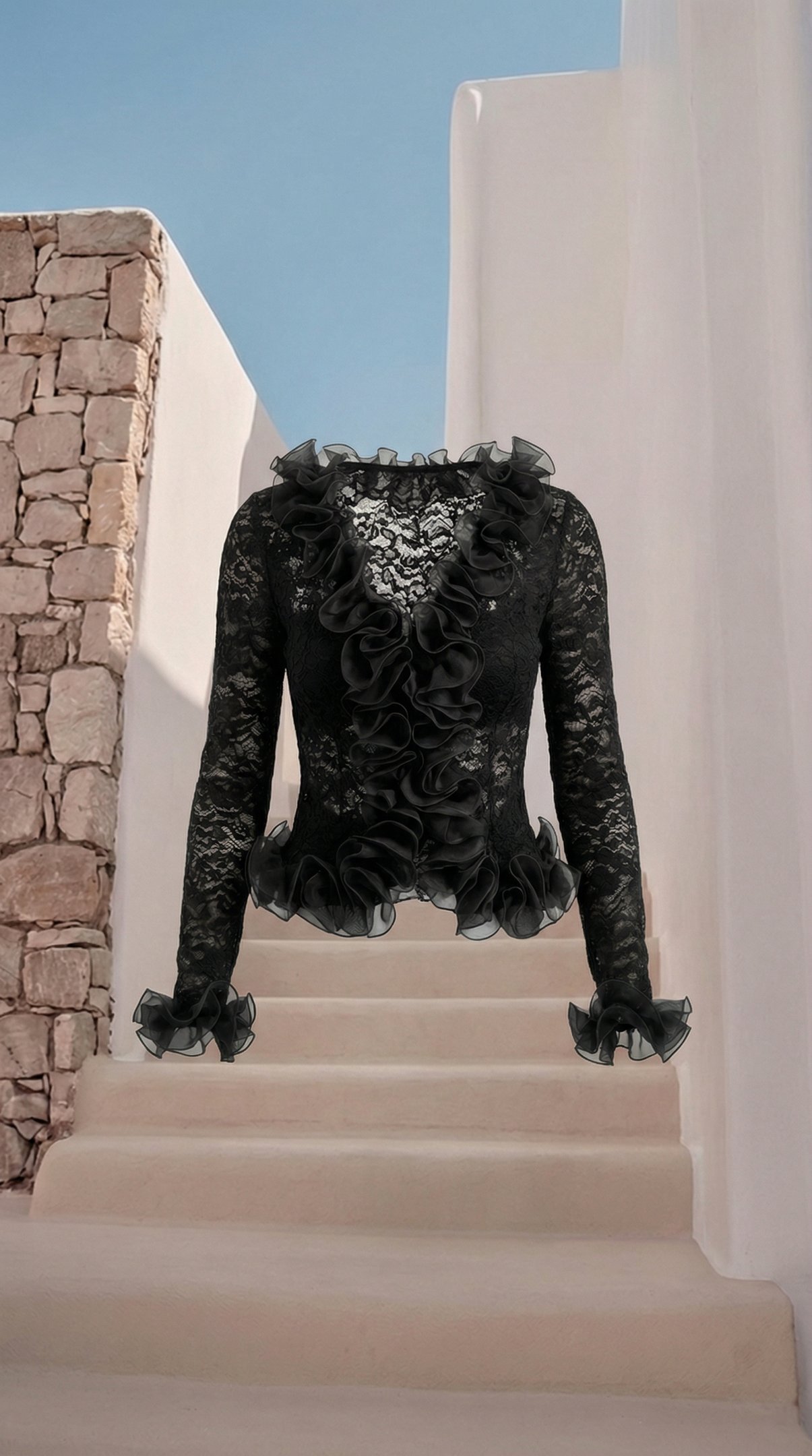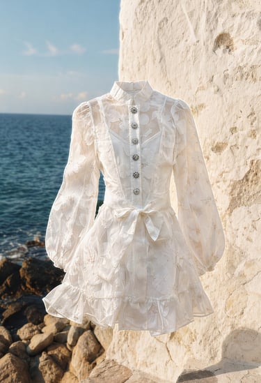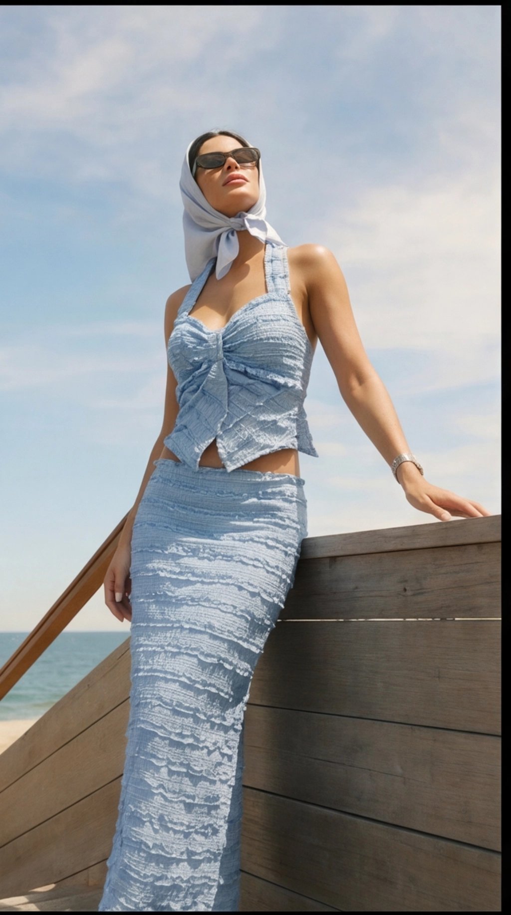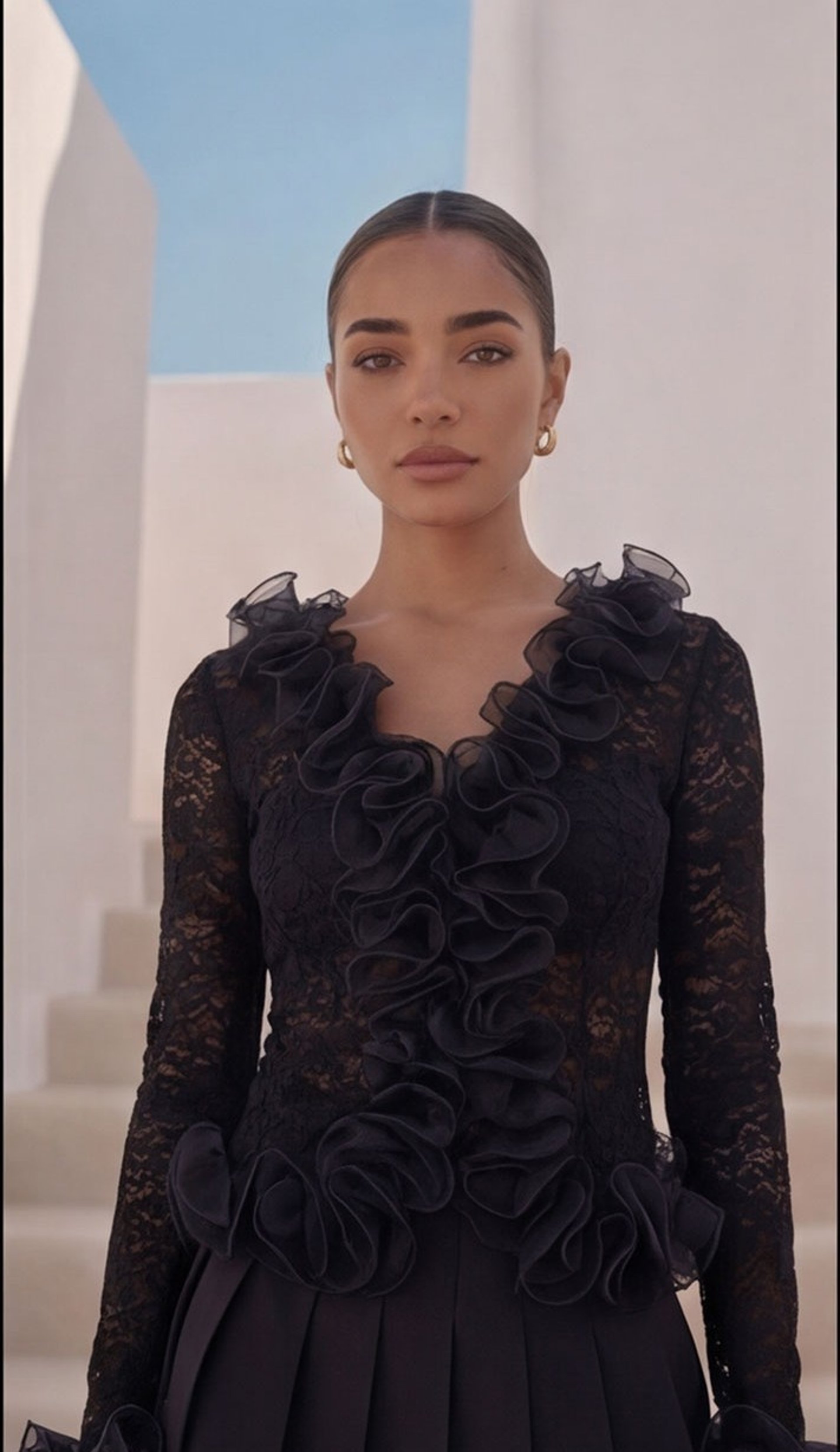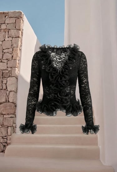 She’s editorial, elevated, and timeless — soft textures meet structured tailoring. High-waist brown pants pair with a ruffled V-neck blouse, layered with a printed cardigan that’s luxe and tactile. Every detail exudes sophistication — elegant, curated, and effortlessly ready for wherever life takes her.